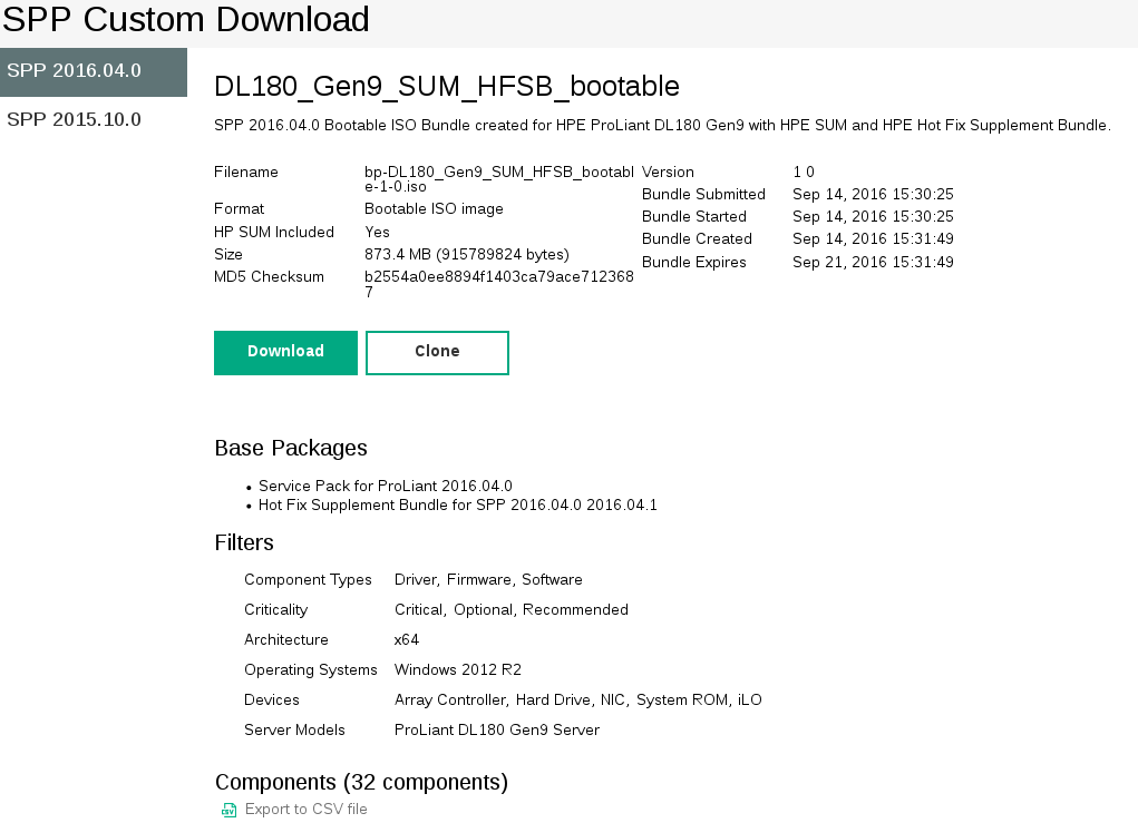The SPP is a delivery mechanism for the firmware and software components for ProLiant servers options and the HPE BladeSystem infrastructure including enclosure components. All software from HPE is provided according to license restrictions. Link to software and driver downloads for Gen9 and Gen10 servers.